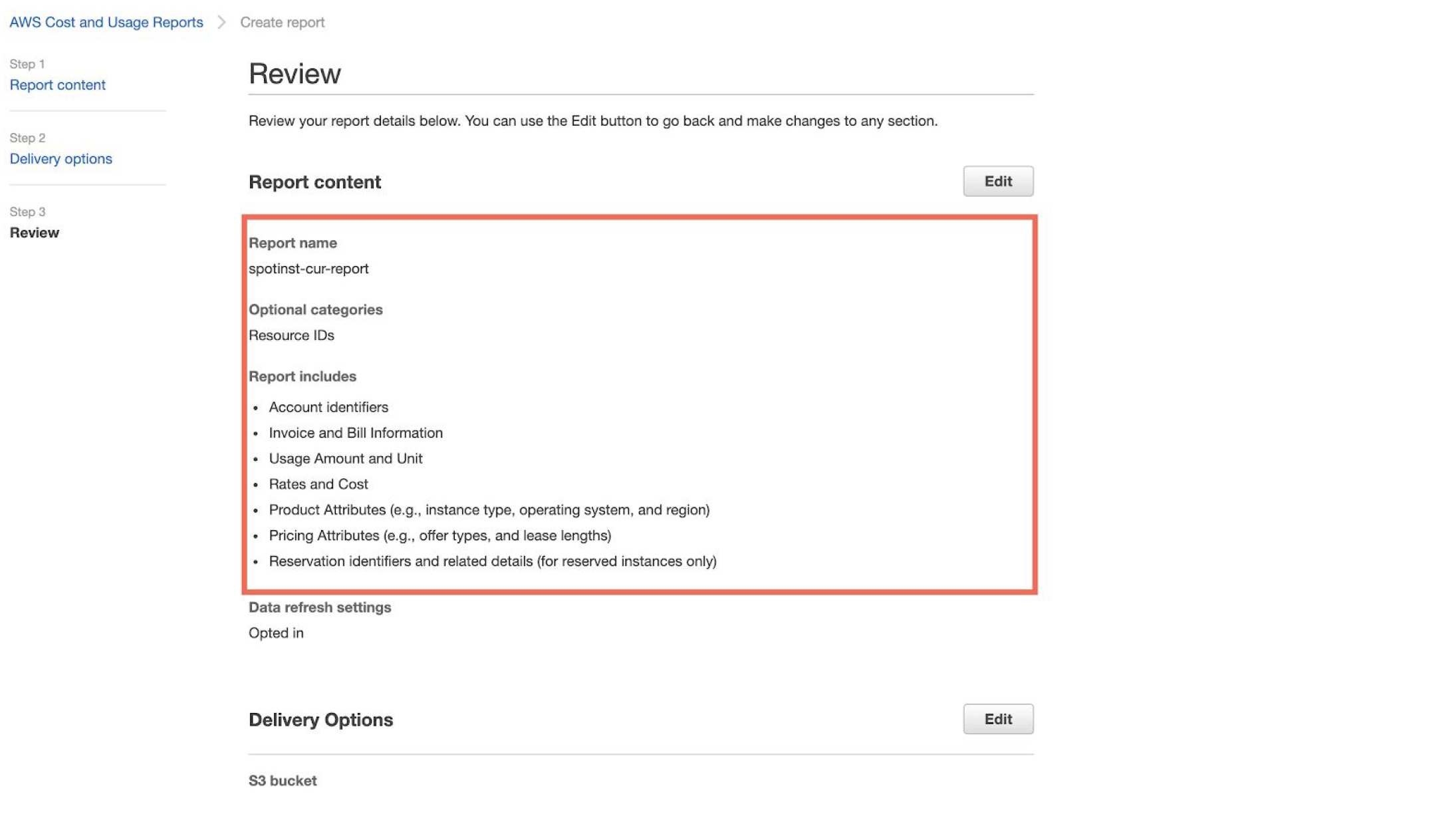 1. For the name for the S3 bucket that CUR reports will be dumped into, paste in the following: spotinst-cur-report. This name must be the same as the report name that you entered previously.