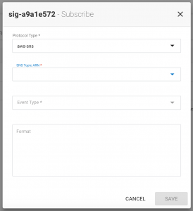 For SNS select aws-sns as the Protocol Type and the SNS Topic ARN the notifications will be posted to. To post the notifications to an HTTP/HTTPS endpoints, select web as the Protocol Type and enter the endpoint.