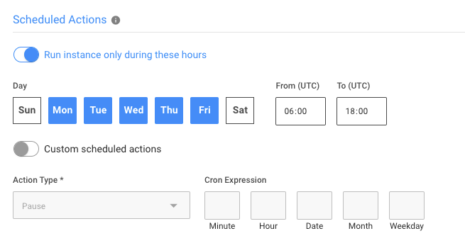 • Run instance only during these hours: Once you configure the time window, the stateful node will be Paused outside of it. At the beginning of the next window, it will be automatically Resumed along with its persisted resources.