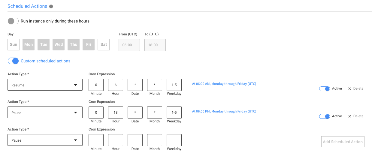 • Custom (individual) scheduled actions, with custom CRON expressions. These actions are supported: